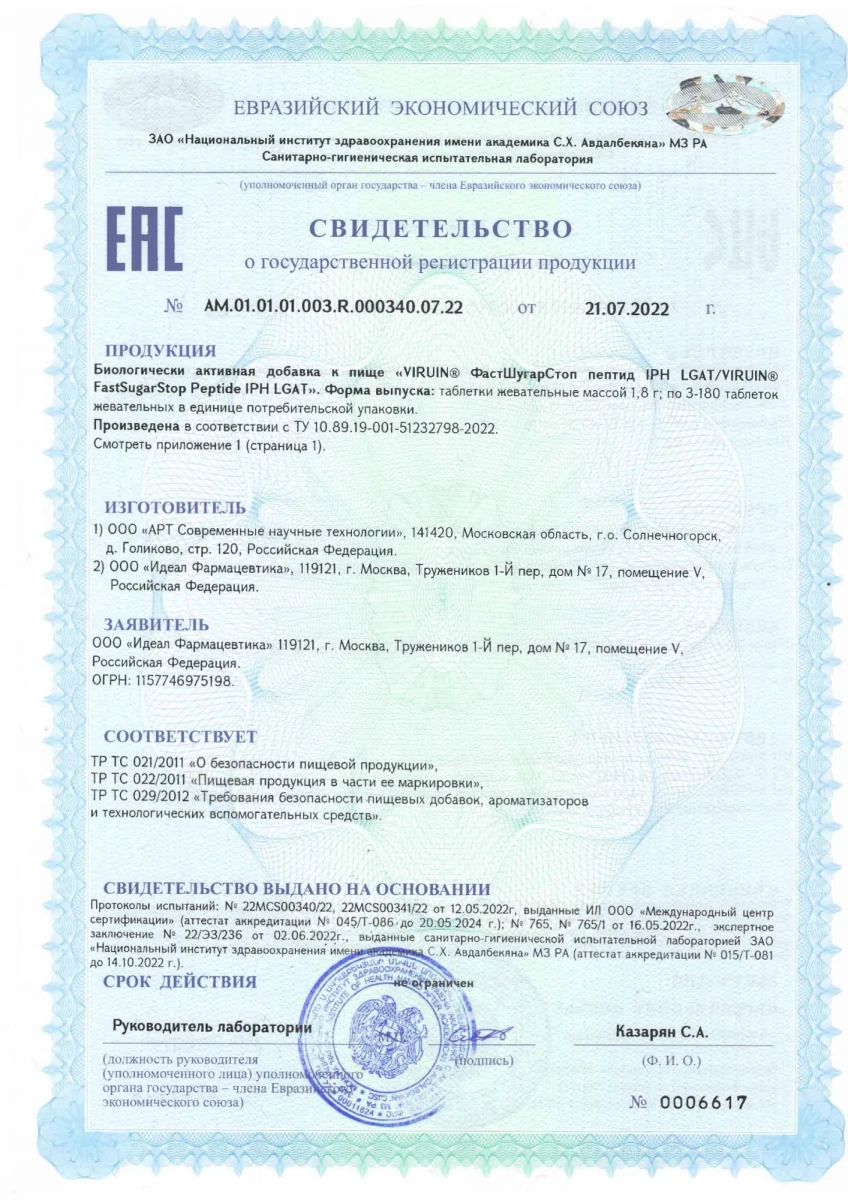 | Номер СГР | от 21.07.2022 г. (VIRUIN® ФастШугарСтоп пептид IPH LGAT) |