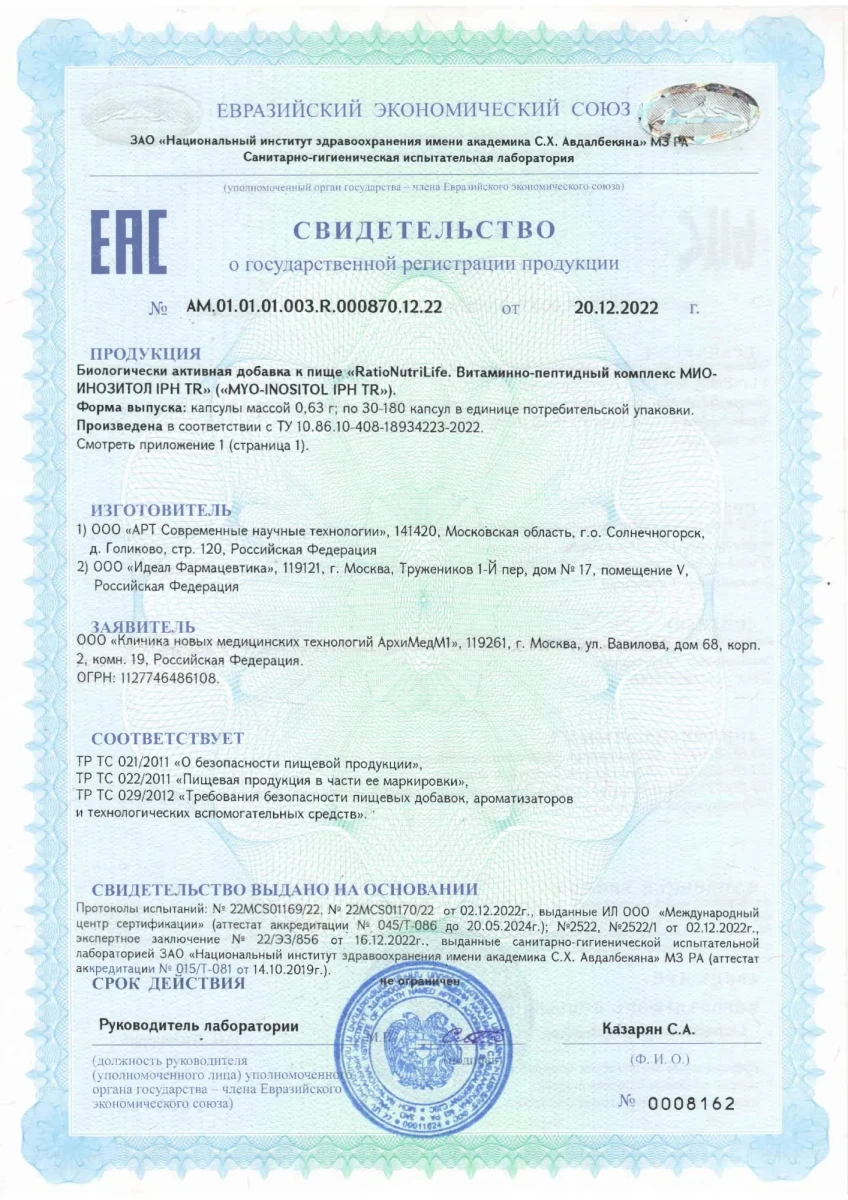 | Ингредиентный состав | Сырьё для пищевой промышленности — витаминно-пептидный комплекс МИО-ИНОЗИТОЛ IPH TR (Мио-инозитол, пептидный комплекс IPH TR); мальтодекстрин; капсула (гипромеллоза) |