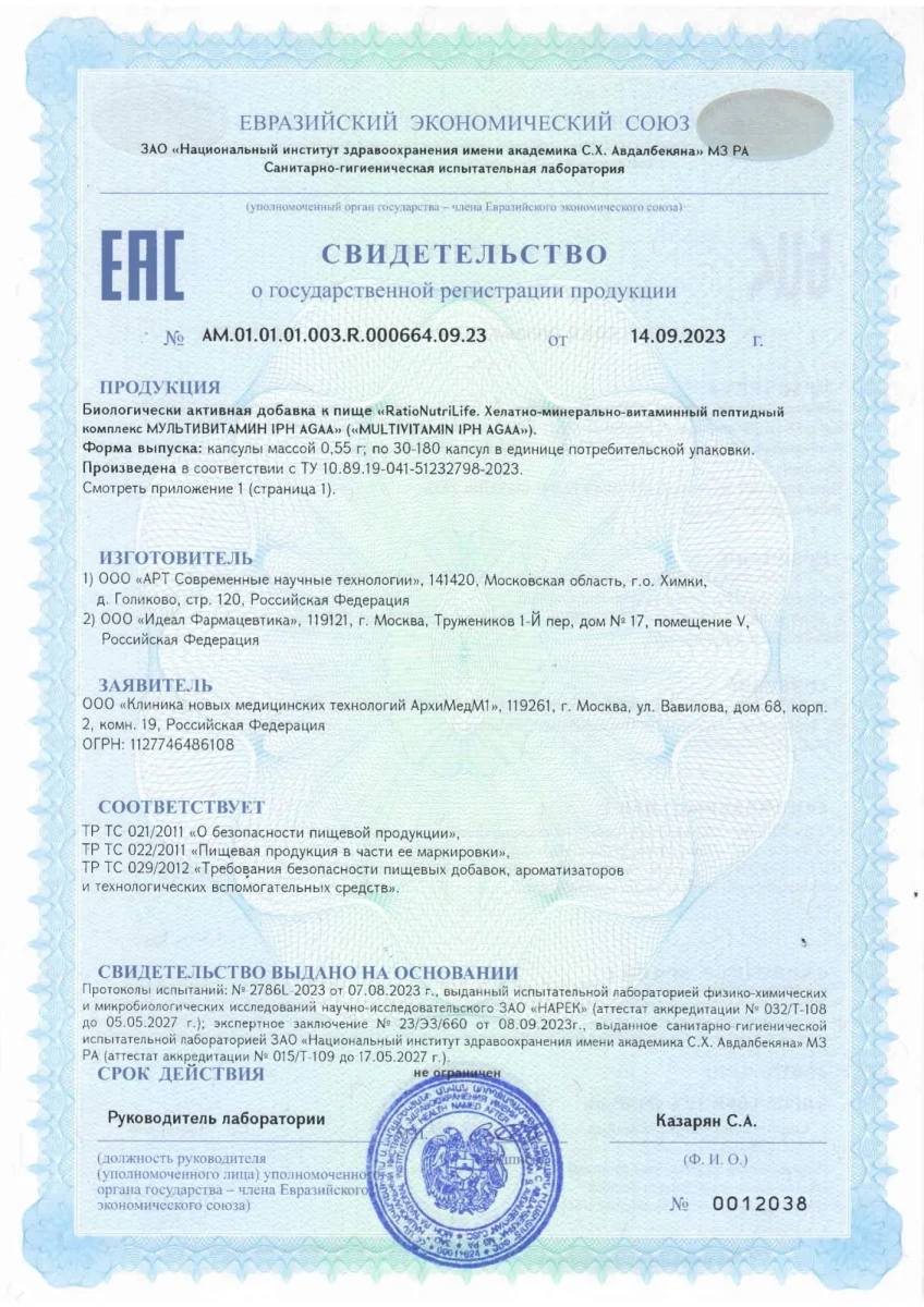 Мультивитамин IPH AGAA — Комплексный мультивитамин с хелатными минералами и пептидом IPH AGAA для восполнения дефицитов и поддержки всех систем организма. Изготовлено с использованием технологий и методик анализа пептидных комплексов Ideal Pharma Peptide GmbH (Германия).